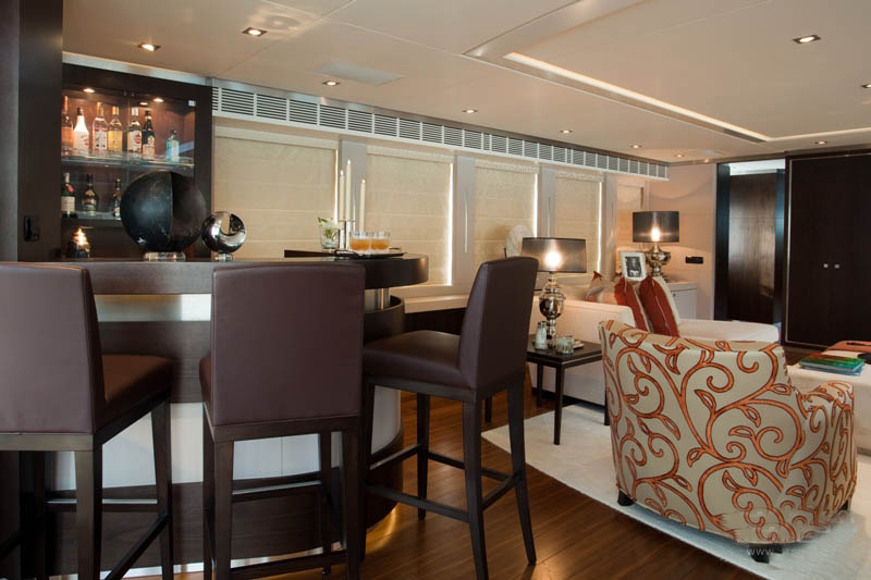 雅致的多功能吧台选用了美国胡桃木和白色卡拉拉大理石,穿过临近的移门可抵达船桥甲板的后部,该区域的主要功能是提供开阔舒适的露天就餐环境。