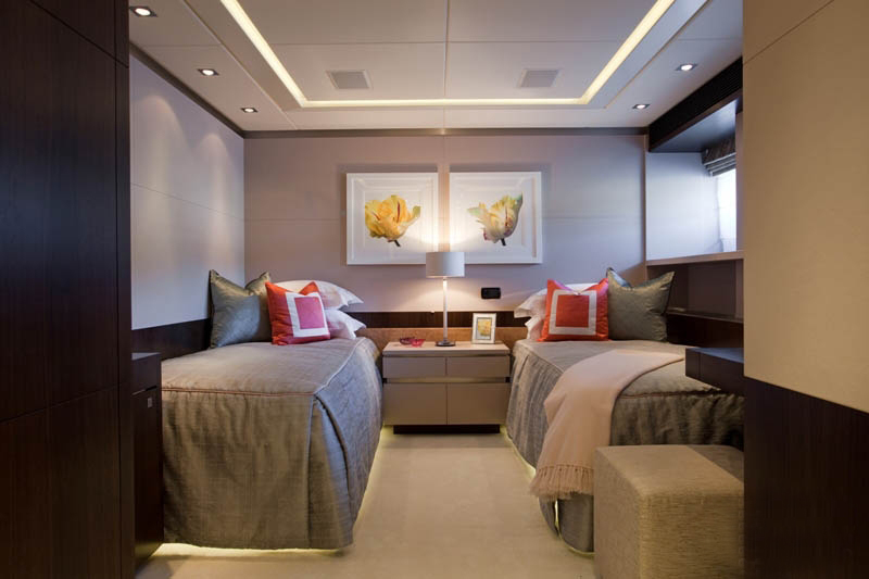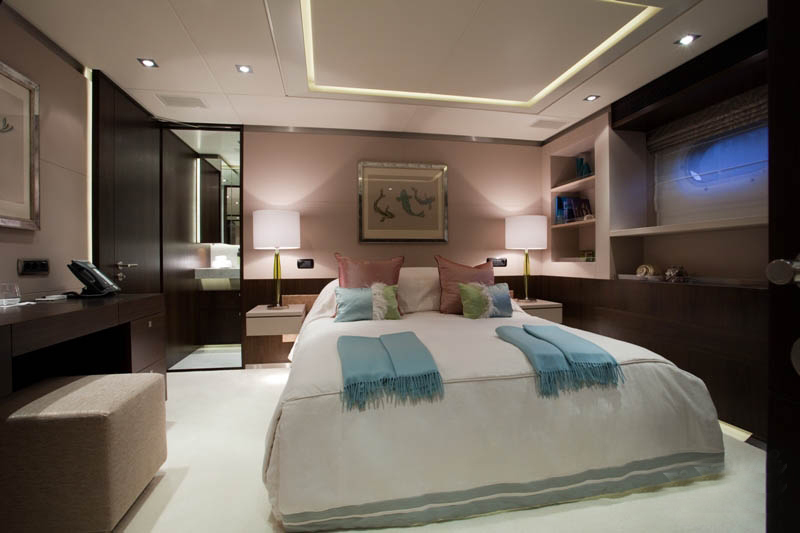 来到位于主甲板前部的主人舱,首先进入的是安静的工作室,随后可穿过带有步入式衣帽间的通道到达主人卧室,卧室的宽度与船宽一致。