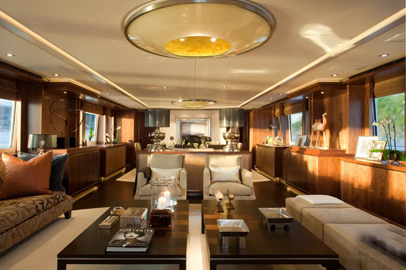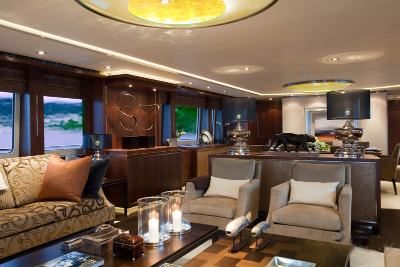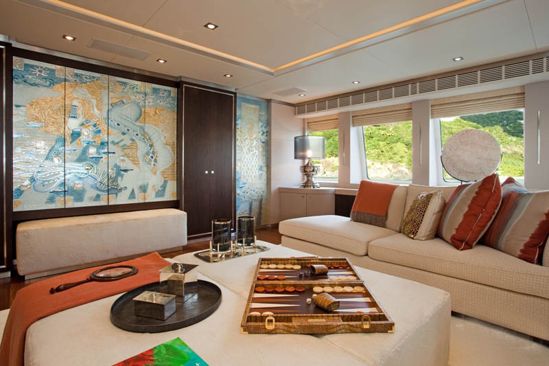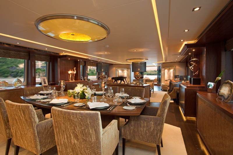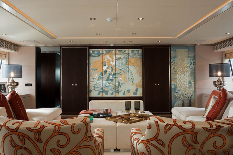 宾客到达主甲板后部,通过艺术装饰走廊,迎面而来的是宽敞的主沙龙。社交区域中央摆放着咖啡桌、扶手椅和8人座围绕的以美国胡桃木定制的桌子,桌面以皮革打造,并镶嵌以复杂的暗银色图案。米黄色和灰褐色构成的柔和主色调,奶油色丝绸地毯格外奢华,部分上漆的独特设计更增添了轻松和个性的氛围。