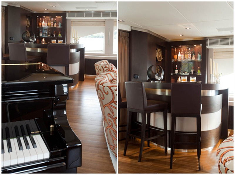 尾部的小型三角钢琴为宾客们提供了完美的听觉享受,特别值得一提的是隐藏于由荷兰玻璃制造商精心制作的艺术品后方的等离子电视,蓝色和浅金色的搭配营造的是浓郁的海洋风。