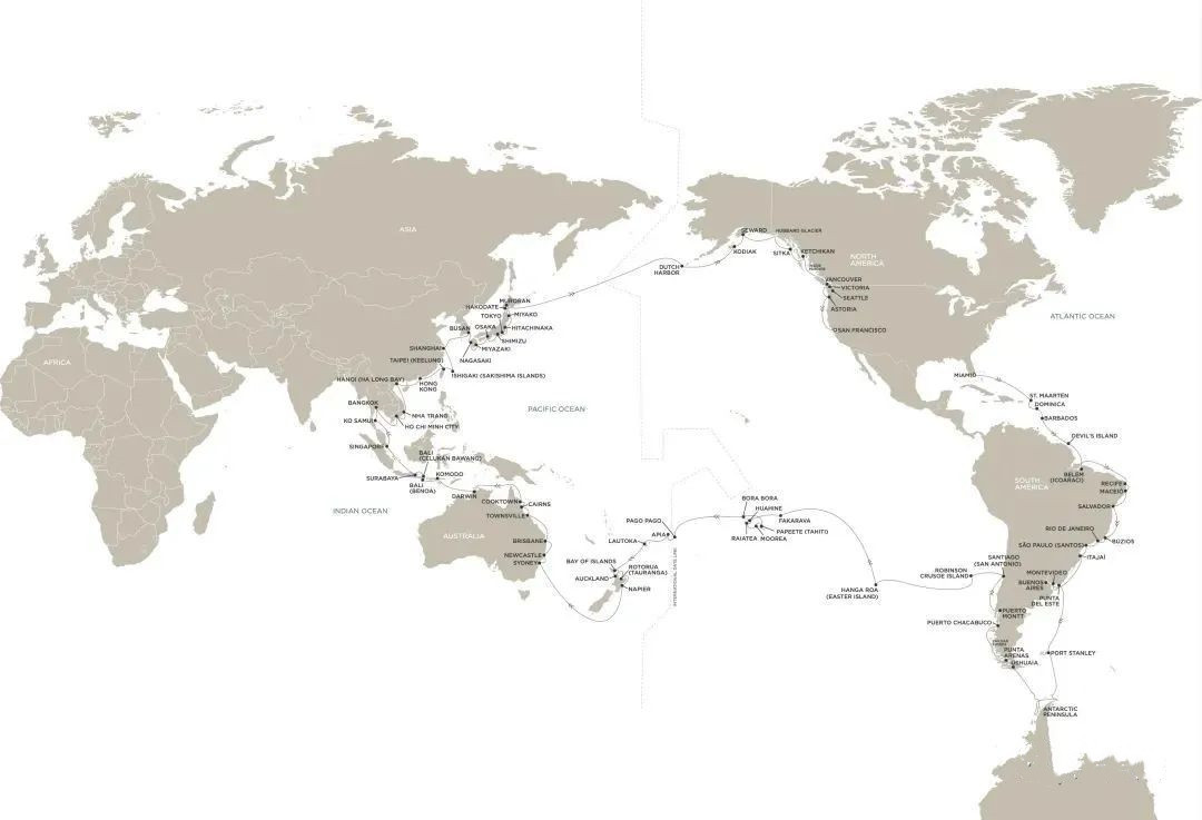 旅程最后,邮轮将穿过国际日期变更线,返回美国,在阿拉斯加停留一段时间后,再前往加拿大,最后驶向旧金山。如果你对150天的海上旅程意犹未尽,还可以选择在这段航程结束时追加18天的行程,跟着“七海水手号”从旧金山经巴拿马运河前往迈阿密。