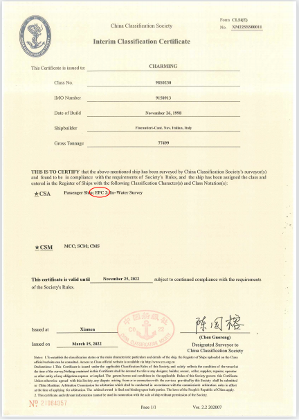 3月15日,三亚国际邮轮发展有限公司旗下的“憧憬”号邮轮成功获颁中国船级社CCS“国内航行船舶入级证书”(Interim Classification Certificate)和船舶防疫安全附加符号EPC2认证。这是2022年中国船级社颁发给国际豪华邮轮的第一张CCS入级证书和第一张CCS邮轮防疫安全附加符号EPC 2认证。