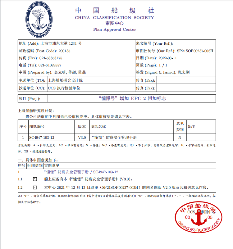 “憧憬”号获颁中国船级社CCS入级证书及EPC 2防疫安全认证