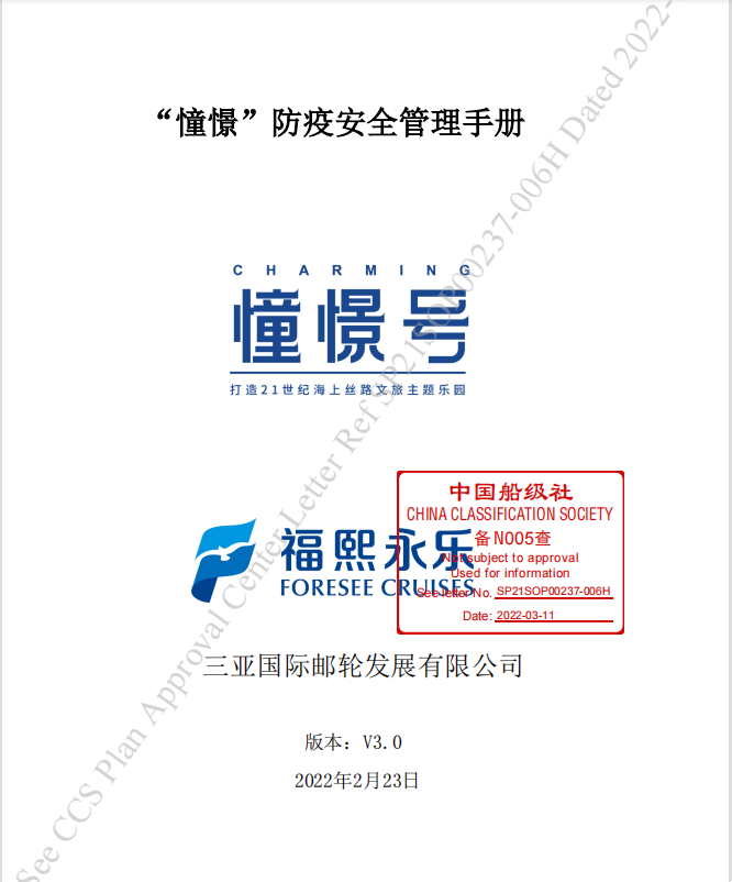 三亚国际邮轮对标CCS相关要求,提前部署,对“憧憬”号进行了一系列设备的改造、改进及加装。完成了科学设立隔离区、隔离区空调通风系统改造及废水(灰水、黑水)系统优化等工作。并持续修订和完善防疫安全管理手册、制作防疫安全控制图,在硬件和软件上均达到防疫安全的标准,获得了CCS船舶防疫安全附加符号认证(EPC 2)。