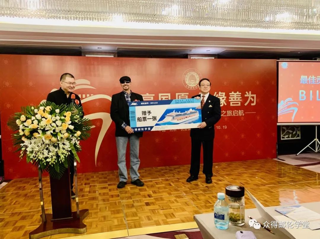 启航仪式环节,Bill先生荣获众得邮轮学堂首位“最佳贡献奖”、获赠船票一张,现场Bill大方地表示了可以捐赠该船票的慷慨。