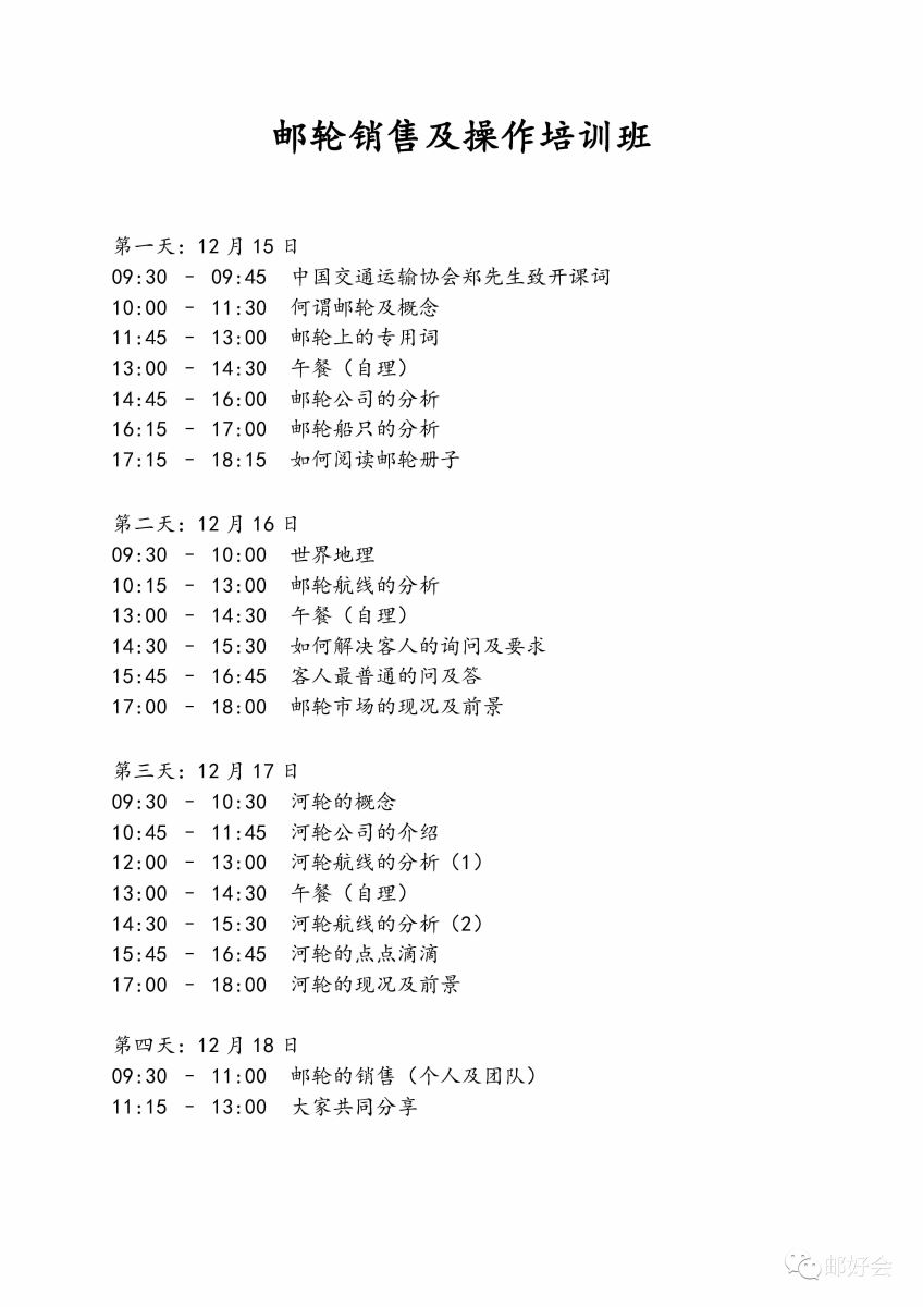 12月18日,中国首期邮轮销售及操作培训班圆满结课。本次课程持续四天,亚洲邮轮旅游资深专家、马来西亚邮轮协会创会主席林志重作为主讲,现场向学员们讲授邮轮及概念、邮轮专用英语、邮轮公司及船只特点分析、世界地理、邮轮航线分析、河轮及市场分析、回应旅客询问等十多个专题,并安排了考试,帮助学员快速、有针对性了解邮轮销售及实操业务。