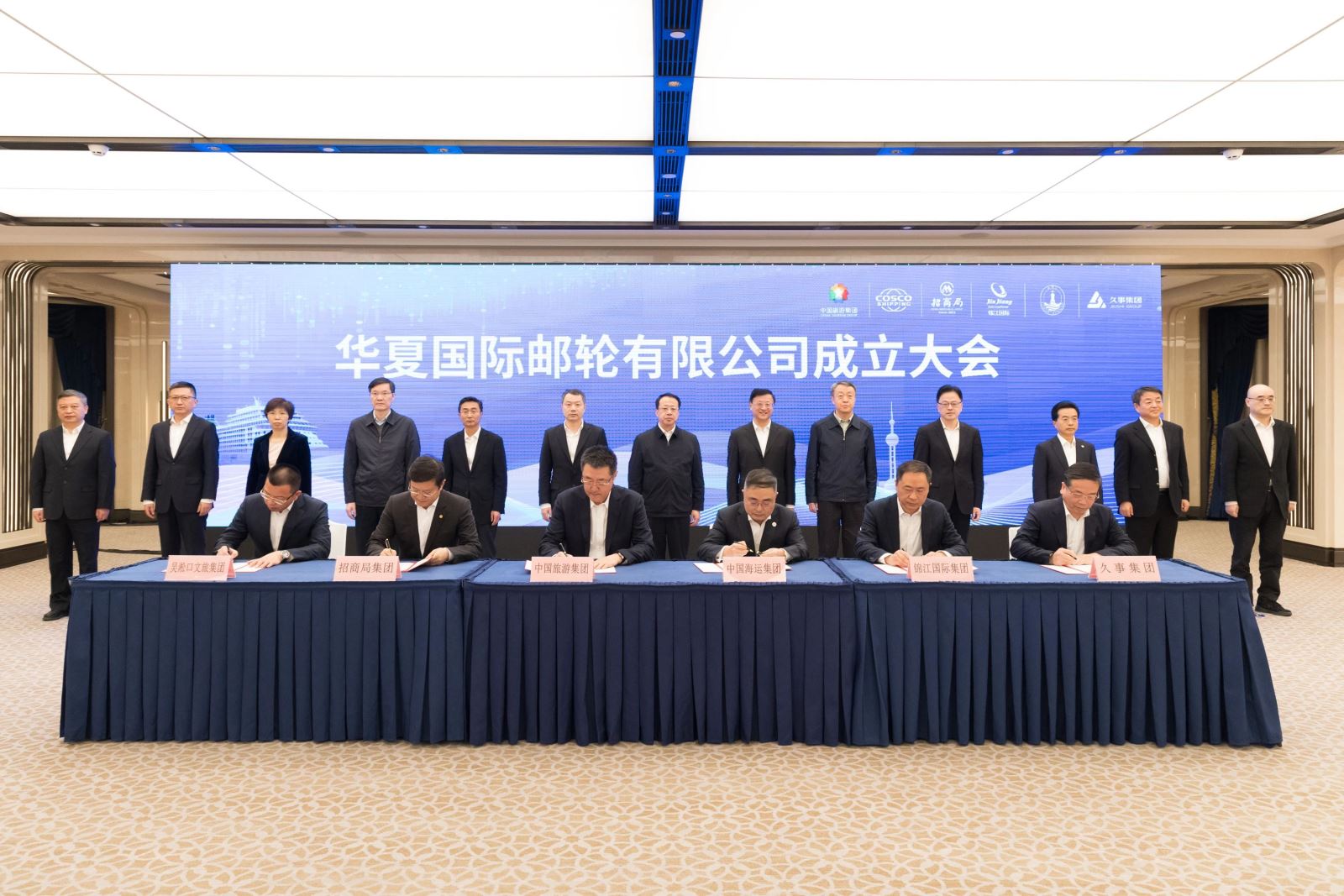成立大会上,龚正、陈寅为华夏国际邮轮有限公司揭牌。中国旅游集团、中国远洋海运集团、招商局集团、锦江国际集团、上海久事集团、吴淞口文旅投资集团相关负责同志签约。