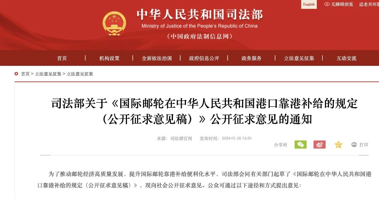 司法部关于《国际邮轮在中华人民共和国港口靠港补给 的规定(公开征求意见稿)》公开征求意见的通知