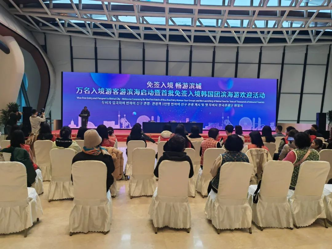 今天上午(11月25日),万名入境游客游滨海启动仪式暨首批免签入境韩国团滨海游欢迎仪式在国家海洋博物馆举行。首批27名韩国游客团抵达滨海新区,开启了在天津的美好旅程。