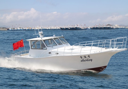 这艘全铝合金休闲游钓艇总长为13.8米,型宽3米 86,型深2米1,配置两台315马力舷内外柴油机,航速可以到34节,装配了1200L的油箱。800L淡水箱。保证续航时间6-8小时。标配了雷达导航,鱼探,甚高频电台等设备。整个船体布局为:主人卧室,会客厅,船长休息室,卫生间,驾驶室。简易厨具。尾部为宽敞的钓鱼区。适合等礁,船钓,拖钓等。