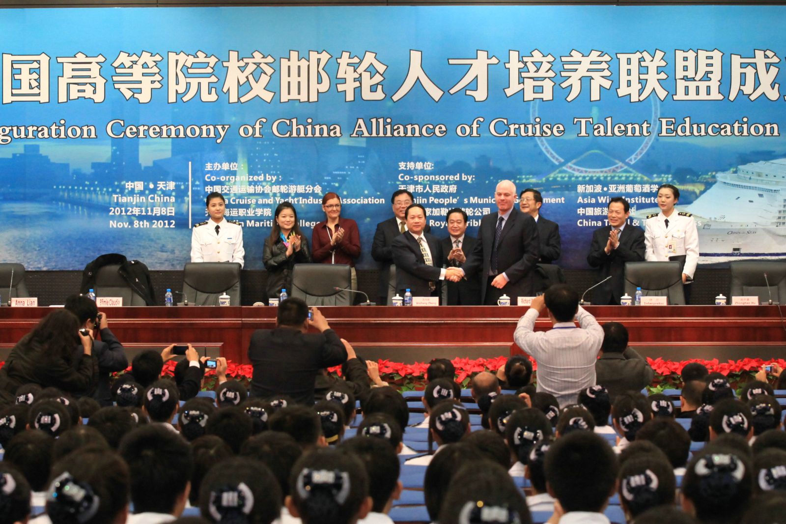 2012年11月8日,正值中国共产党第十八次代表大会召开之际,由中国交通运输协会邮轮游艇分会(CCYIA)、天津海运职业学院 (TMC)主办,天津市人民政府、美国皇家加勒比游轮有限公司(RCL)、新加坡亚洲葡萄酒学会(Asia Wine Institute)和中国旅游出版社以及来自全国22家本、专科酒店和邮轮管理专业的院校共计60人参加的“中国高等院校邮轮人才培养联盟”成立大会(China Alliance of Cruise Talent Education and Training,简称CACTET)在天津海运职业学院召开。