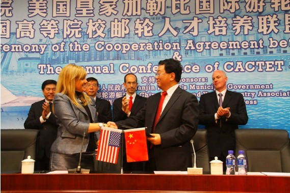2013年6月17日-18日,美国皇家加勒比游轮有限公司和天津海运职业学院合作协议签署仪式在天津海运职业学院隆重举行,同时中国高等院校邮轮人才培养联盟2013年年会也隆重举行。美国皇家加勒比国际游轮公司全球总裁兼首席执行官亚当先生率领十余名高管以及来自全国30余所本专科邮轮院校参加了此次盛会。